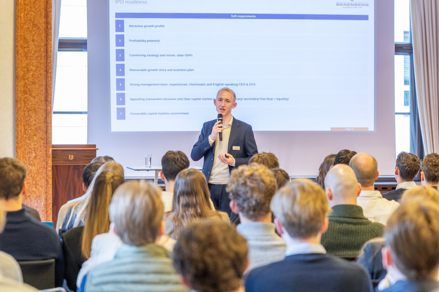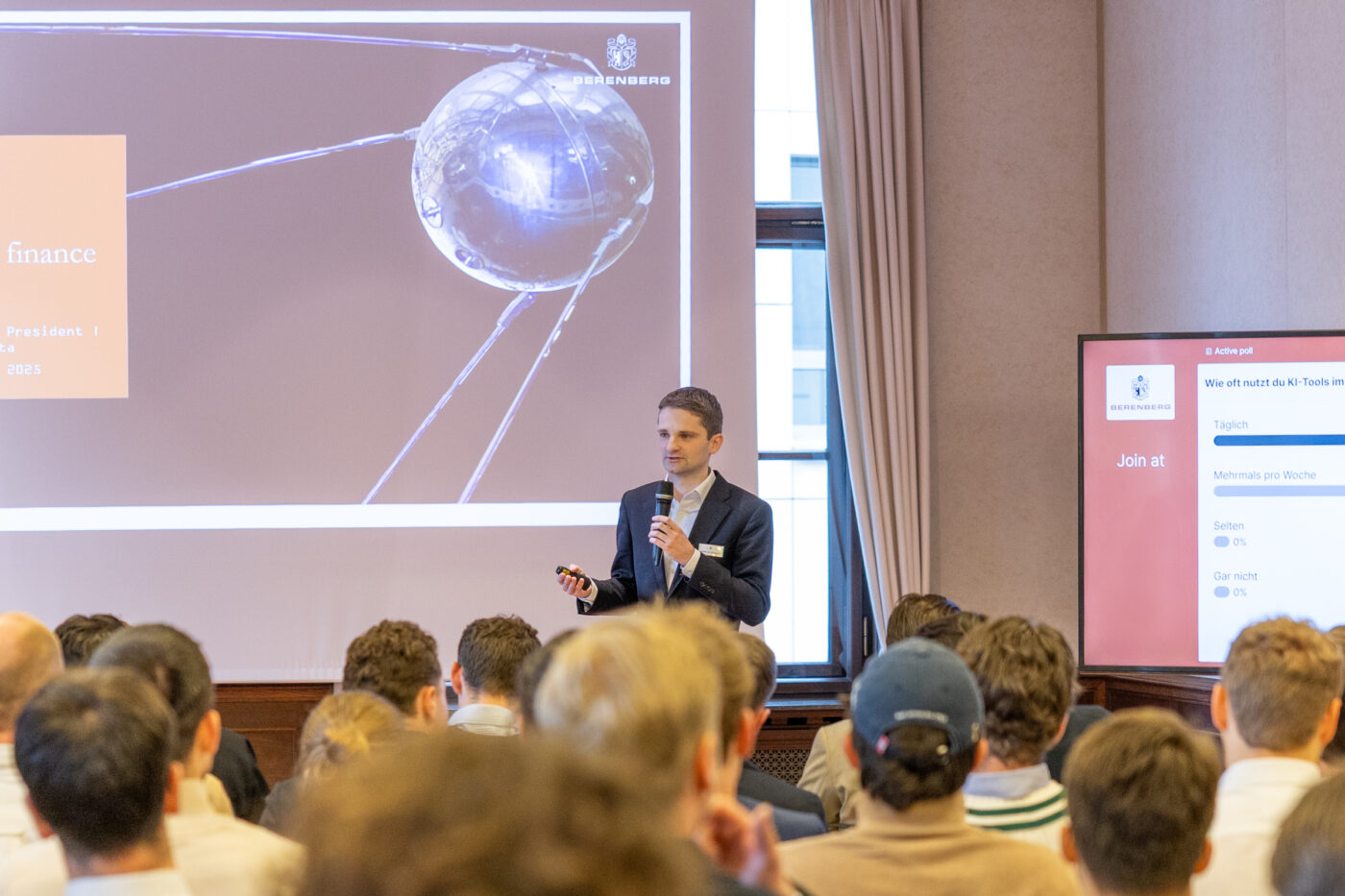 Den inhaltlichen Auftakt machte Julius Voigt mit einem spannenden Vortrag über das Investment Banking bei Berenberg. Ein besonderer Fokus lag auf Börsengängen, also Initial Public Offerings (IPOs), insbesondere in der DACH-Region. Dank eines interaktiven Tools konnten die Teilnehmerinnen und Teilnehmer jederzeit Fragen stellen. Das Angebot wurde rege genutzt und es entstand ein lebendiger Austausch.
